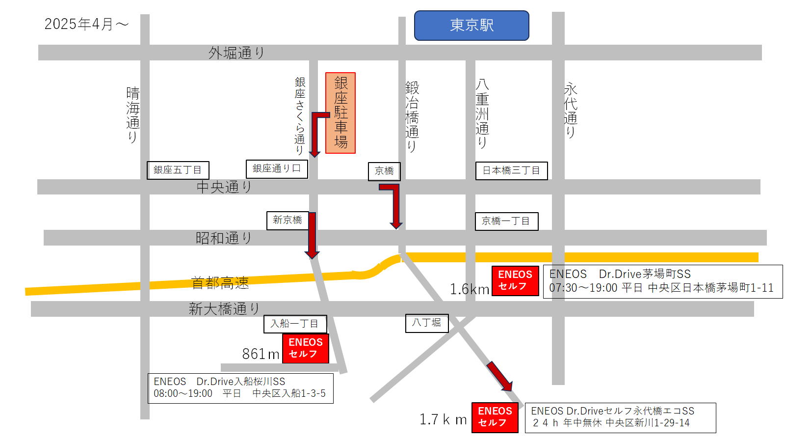 | 昭 和 通 り | 築地・東銀座方面から | 信号「新京橋」を左折、信号「銀座通り口」を直進し約50m先右側に出入口 |